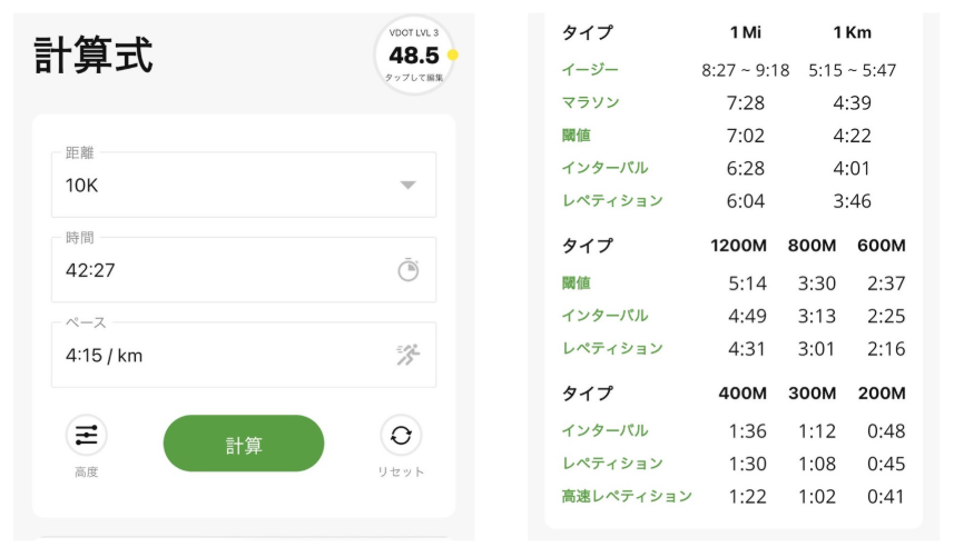 自身の走るペースを具体的な数値として示してくれるアプリとして「VDOT Calculator」というものがあります。VDOTは自己ベストのタイムを打ち込むことで自身の走るペースとトレーニング強度を示してくれる優秀なアプリです。
