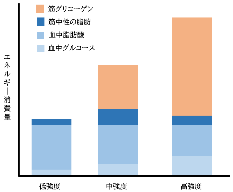 低強度の運動と高強度の運動も消費カロリーの内訳をみると、実は脂肪の消費は大きく変わりません。つまり、走るペースが一定以上になると消費出来る脂肪は変わらないということです。