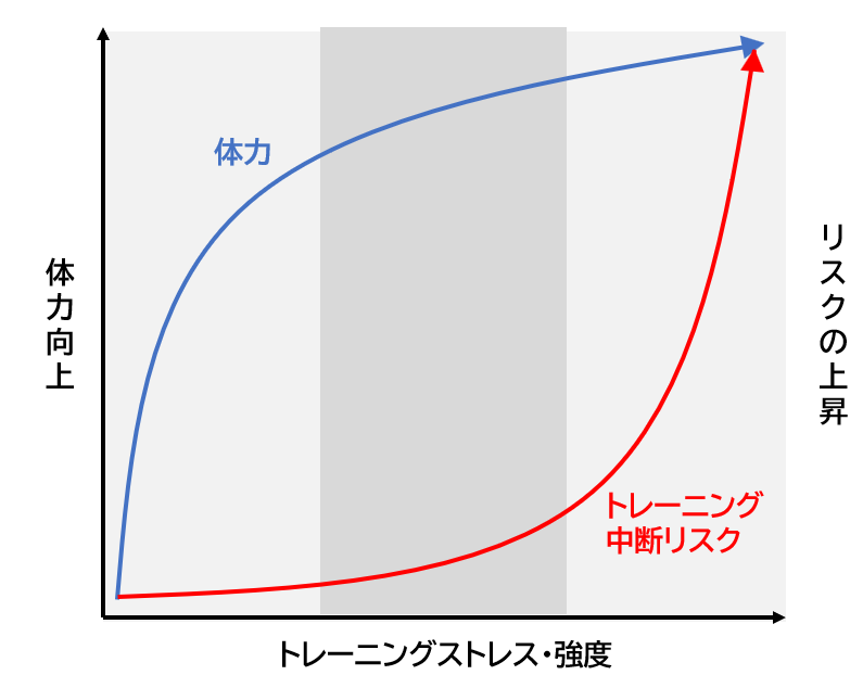 運動強度が高いほど、呼吸が荒く、持続できる運動時間は短くなり、運動後の必要な回復時間も長くなります。