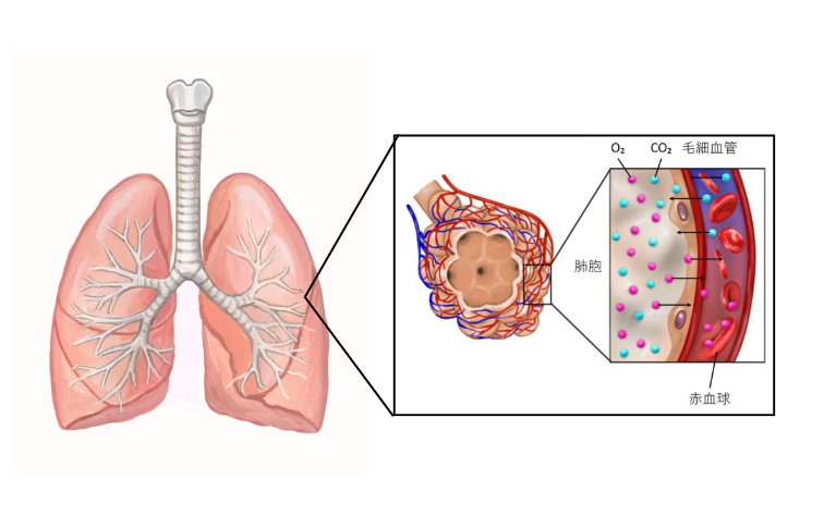 吸った空気は気管・気管支を通って、最終的に肺の奥にある肺胞という部分に辿り着くことで酸素を身体に取り込むことが出来ます。吸った酸素は肺胞まで行きわたった部分だけ取り込むことができ、気管・気管支にある部分は死腔といい、身体に取り込むことが出来ない部分です。