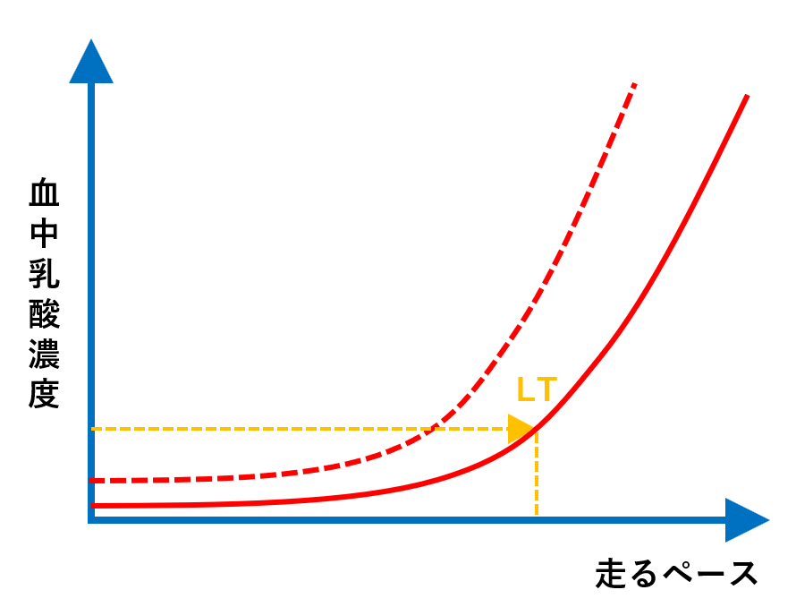 乳酸が蓄積されていくポイントをLT(乳酸性作業閾値)といい、VO2maxが高いランナーほど、乳酸の処理能力も上がっていくため、速いペースを維持しやすくなります。
